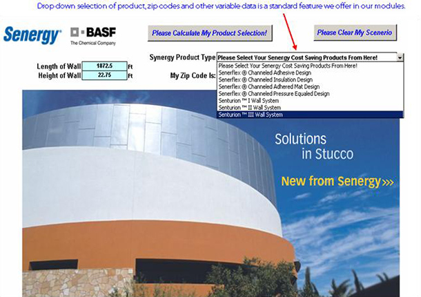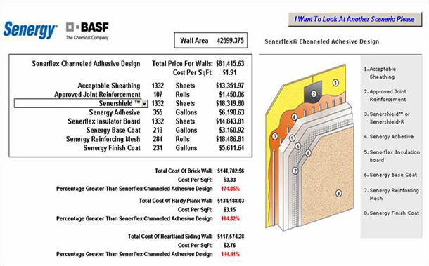 The high quality Senergy products give BASF (NYSE: BF) a market perception problem, that a Senergy system was more expensive that a non-BASF system. BASF wanted to easily display the competitive alternative from the competition to show that the Senergy wall systems were priced competitively. Not to mention, design to last much longer as well.