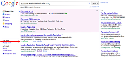 This analysis from an Online Behavioral Marketing case study for Factoring Service in the financial industry, is an example of the utilization of its proprietary software and systems. Online Behavioral Marketing was required to target highly qualified opportunity key terms; such as Invoice Cash Flow Factoring, Accounts Receivable Invoice Factoring, Account Receivable Invoices Factoring, Receivables Ar Factoring, Invoicing Ar Factoring, Invoice Account Receivable Factoring, Cash Flow Factoring, Factoring Invoices Company. The platform was successful in delivering highly calibrated website pages relevant to the aforementioned key terms.